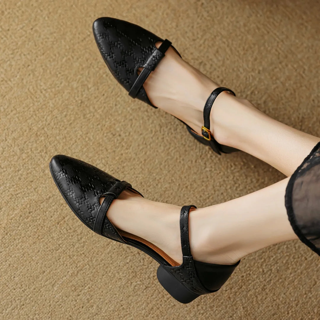 A blend of timeless grace and modern ease, the Amélis Leather Heels are crafted from supple leather and set on a sculpted block heel that balances poise with comfort. A slender ankle strap and pointed toe define a clean silhouette, carrying you effortlessly from daylight hours to evening occasions.